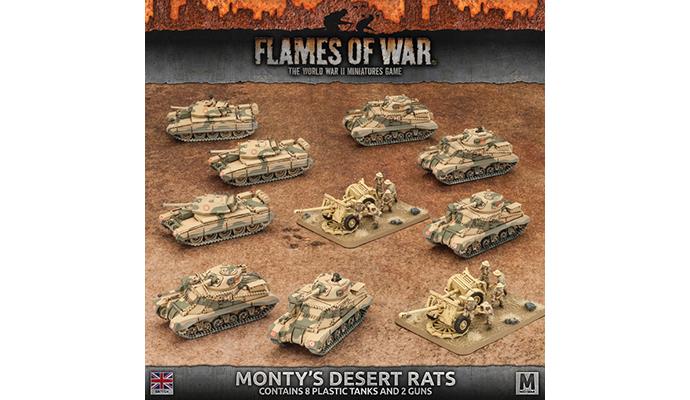 Includes five plastic Grant tanks, three plastic Crusader tanks, one plastic Tank Commander sprue, two plastic 17/25 pdr or 25 pdr guns, two plastic Gun Crew sprues, one mini 4th Flames Of War rulebook, two Decal sheets and eight Unit cards
