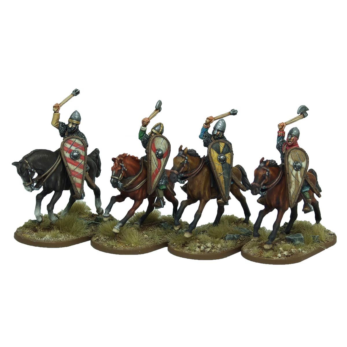 Pack contains four different mounted figures all different, three different heavy horses plus one duplicate and four kite shields. It also contains four hand weapons two maces and two axes with a hand attached should you want your warriors to get up close and personal or to be used to designate leaders. Cut off the hand at the wrist, drill a hole for the plug on the wrist and apply a drop of super glue to give you a very different looking model.