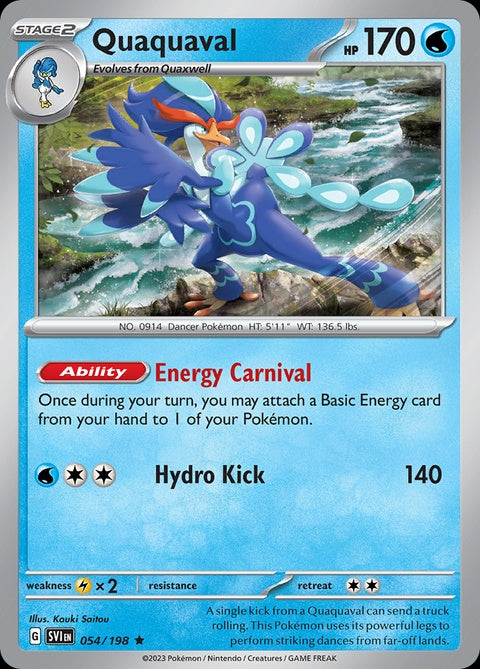 A single kick from a Quaquaval can send a truck rolling. This Pokémon uses its powerful legs to perform striking dances from far-off lands.