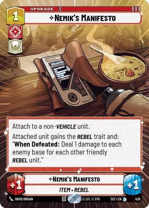 Attached unit gains the Rebel trait and: “When Defeated: Deal 1 damage to each enemy base for each other friendly Rebel unit.”