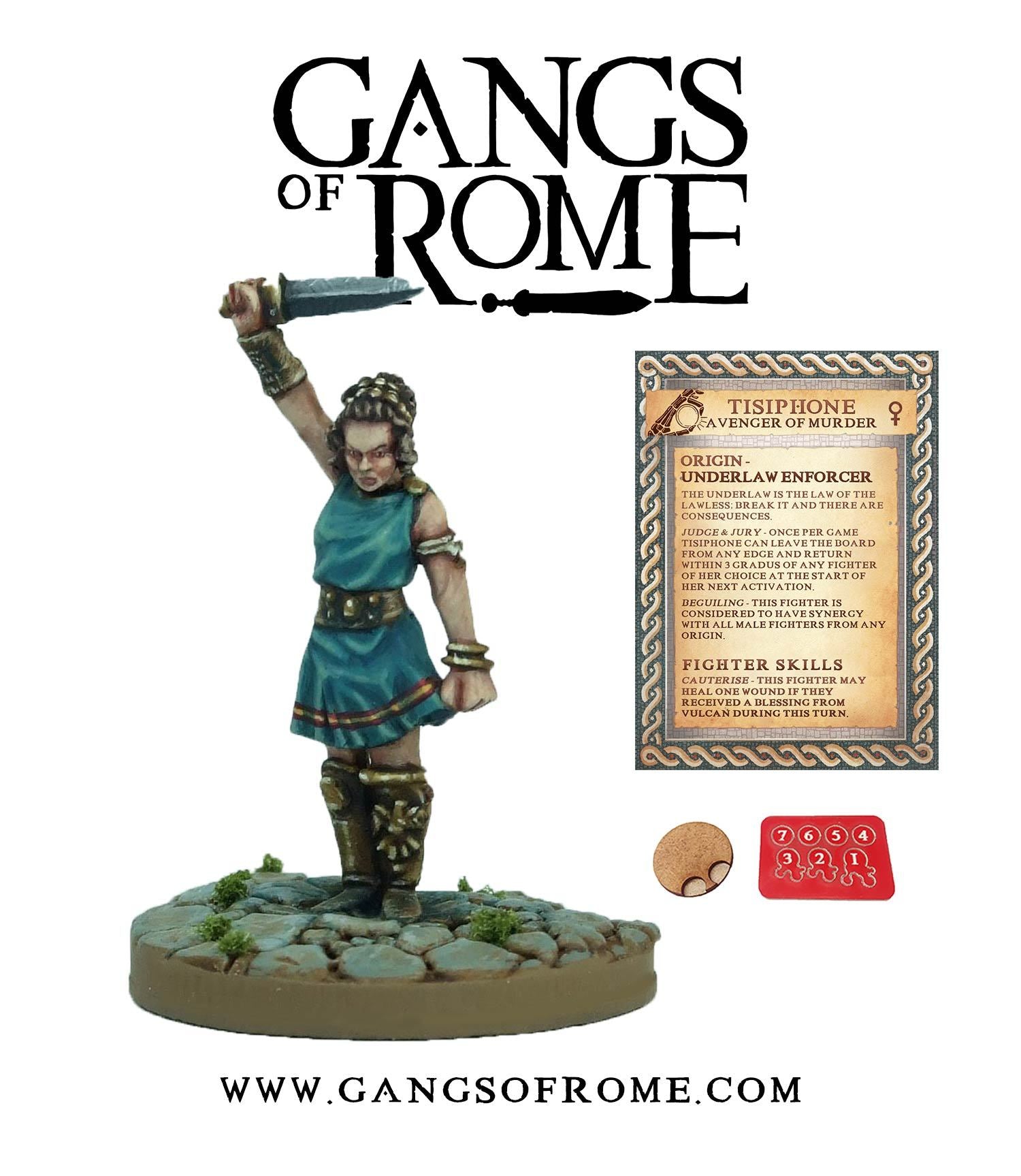 Miniatured supplied with a jigsaw base, flesh counters and Tisiphone's fighter card so she can be used in Gangs of Rome.